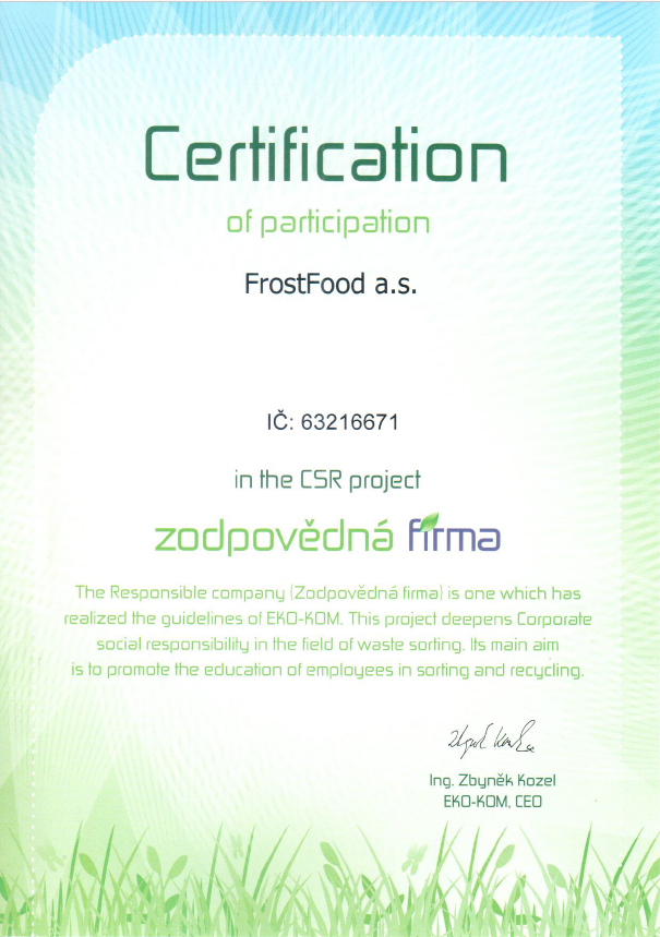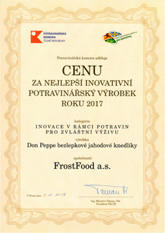 Věnujeme mimořádnou pozornost kontrole surovin a celých výrobních procesů. Usilujeme o nejlepší kvalitu našich výrobků. Vlastníme certifikát kvality IFS. Neustále přemýšlíme o tom, co naši zákazníci chtějí a snažíme se naplnit vaše očekávání častými inovacemi. V roce 2017 nám Potravinářská komora udělila cenu za nejlepší inovativní potravinářský výrobek za Don Peppe bezlepkové jahodové knedlíky. Dále jsme zapojeni do projektu - zodpovědná firma. Je to vzdělávací projekt, který podporuje vzdělávání v oblasti třídění odpadu. Jeho hlavním cílem je předat zaměstnancům českých firem prostřednictvím jejich zaměstnavatelů informace o správném nakládání s odpadem a to nejen v administrativních prostorách firmy, ale i v běžném každodenním životě.