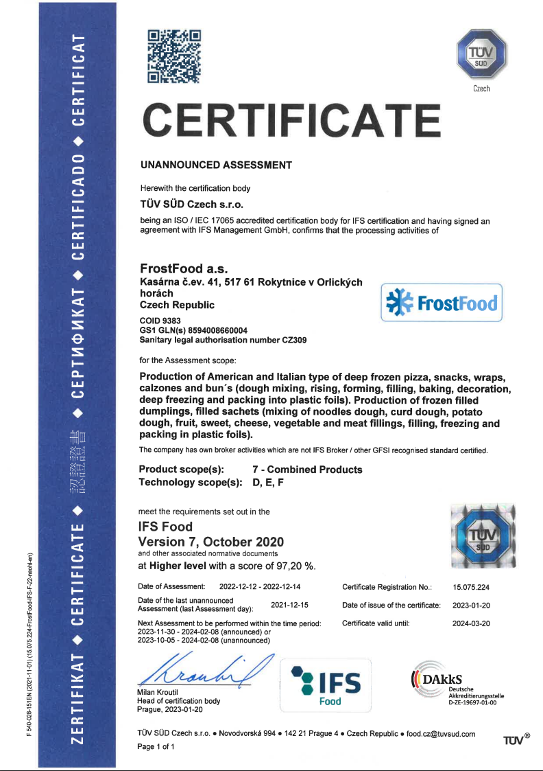 Dnes jsme jedničkou na českém trhu mražených knedlíků a dvojkou v kategorii mražených pizz. Jsme prvním a jediným výrobcem mražené pizzy v České Republice a úspěšně exportujeme do mnoha evropských zemí.