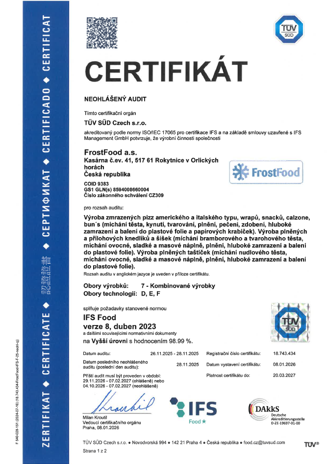 Již od roku 1994 pro vás ve firmě FrostFood v Orlických horách vyrábíme nejlepší mraženou pizzu a knedlíky. České tradiční receptury jsme spojili s vysoce kvalitními surovinami. Ze všech sil se pro vás snažíme vyrábět produkty, které se těší vaší důvěře. Chtěli bychom vám usnadnit dnešní uspěchaný životní styl, tím, že si snadno připravíte chutné a kvalitní jídlo během pár minut. Neúnavně rozšiřujeme a inovujeme náš sortiment. Naší největší odměnou je, že vám chutná.